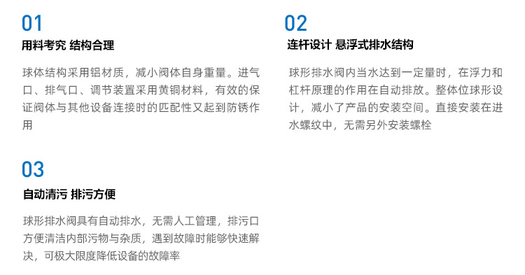 鋁制浮球桿桿式球形排水閥,可自動排水無需人工管理和其他功能,整體位球體設(shè)計減小了產(chǎn)品的安裝空間,閥體可以直接安裝在進(jìn)水螺紋上,無需另外安裝螺栓。